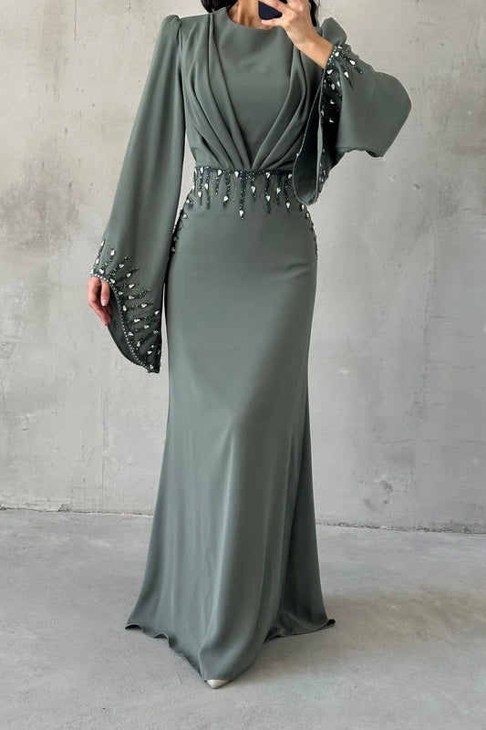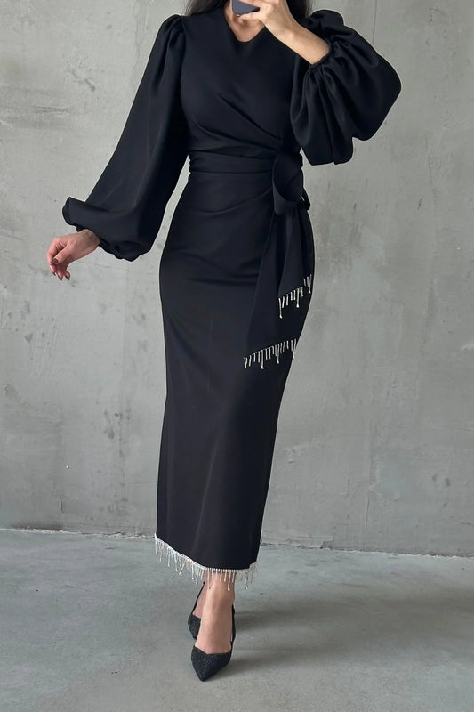 Beautiful Detailed Waist Tied Crepe Dress 3021