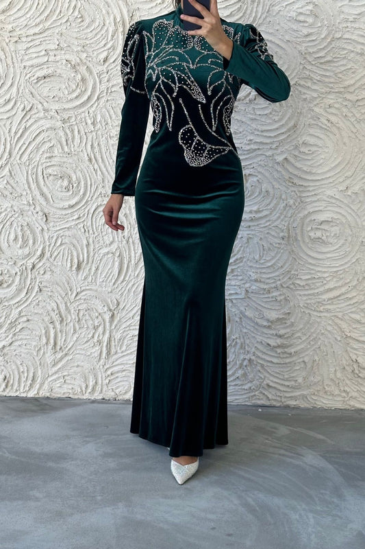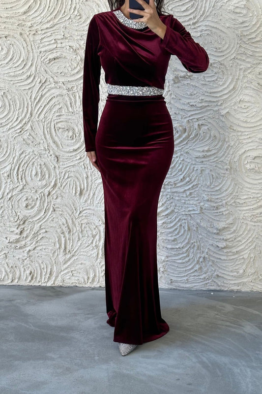Elegant Stone Detailed Velvet Evening Dress 8022