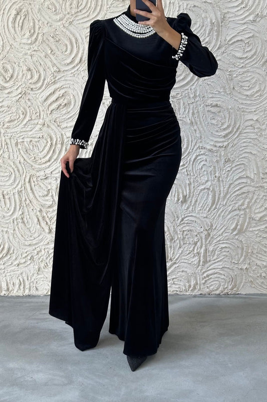 Elegant Velvet Evening Dress Embellished with Pearls 8021