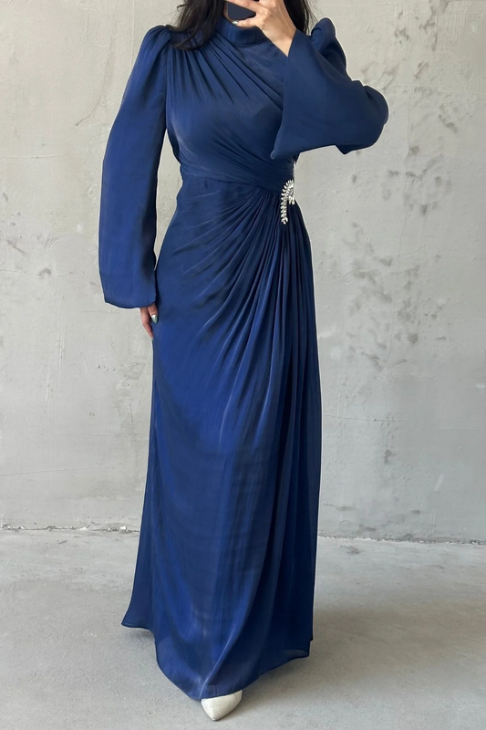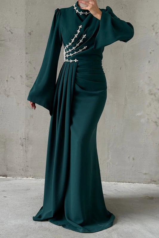Elegant Stone Detailed Pleated Crepe Evening Dress 4657