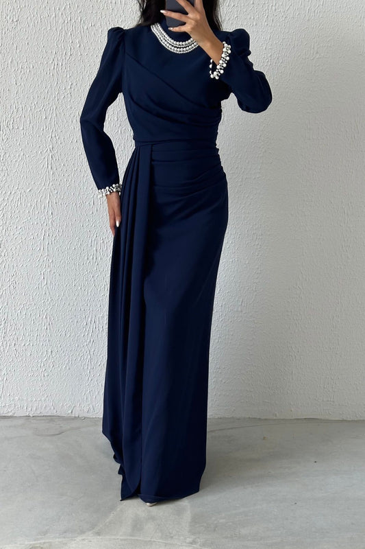 Elegant Crepe Evening Dress Embellished with Pearls 8032