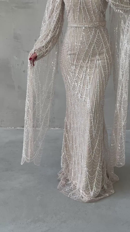 Glittered Hijab Evening Dress Ecru with Sleeve Detail 6981